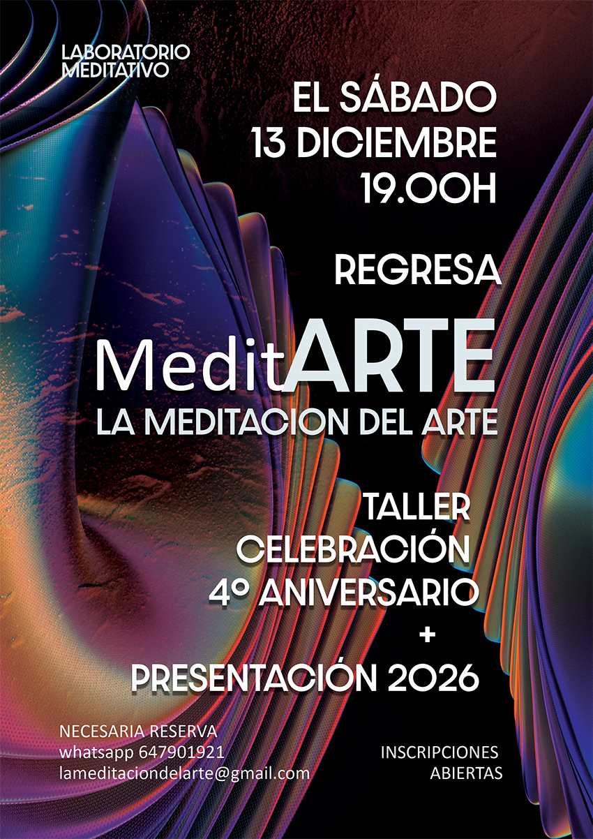 El 13 de diciembre, celebramos el 4º aniversario del primer taller de MeditARTE, ARTE Y MEDITACIÓN, la expresión de la esencia humana creando un nuevo ciclo que dará comienzo este sábado, se trata de una actividad en la que a través de la meditación diseñada para, por y con una obra de arte los participantes puedan llegar a focalizar su atención sobre ésta de tal manera que abra sentidos internos y profundos que le conecten con ella y con el autor, de una forma genuina y muy personal.